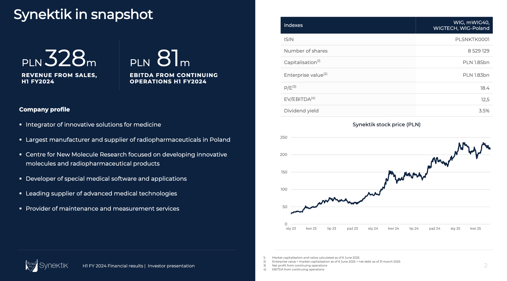 Synektik ($SNT) is a Polish healthcare company. They make and sell medical imaging systems, like scanners and cameras. They help doctors see inside the body of their patients. Synektik earns money by selling this equipment to hospitals and clinics.Synektik makes special medicines called radiopharmaceuticals. Doctors use them to find diseases like cancer inside the body.