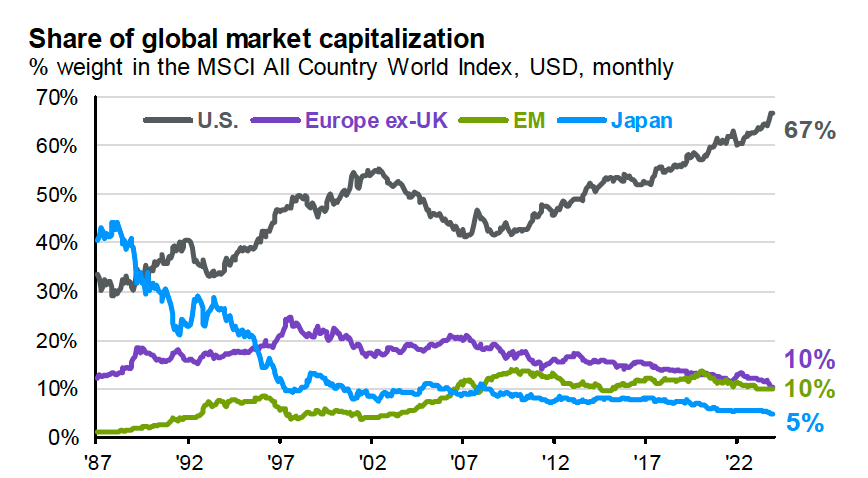 The weight of US stocks in global market capitalization has reached its highest level since 1987: