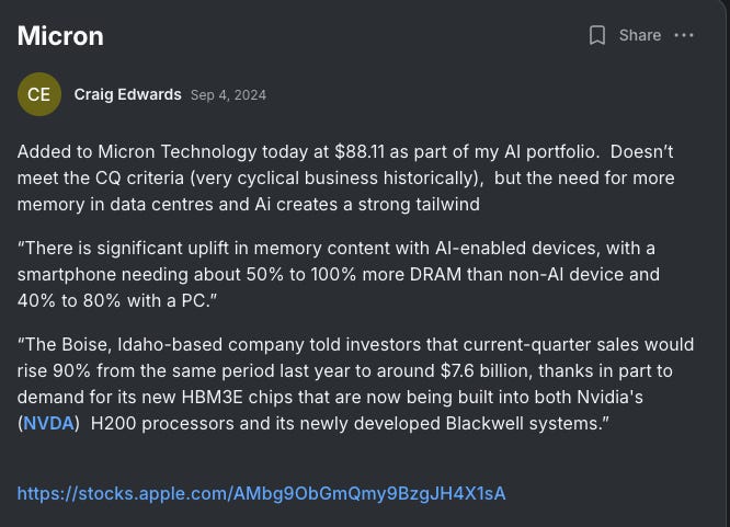 An example? Craig Edwards pitched Micron ($MU) as an interesting idea in September 2024.