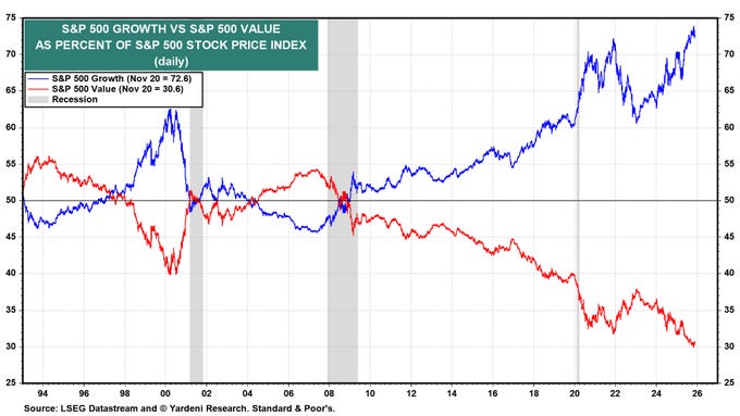 The chart shows the weight of growth stocks (blue line) versus value stocks (red line) in the S&P 500.