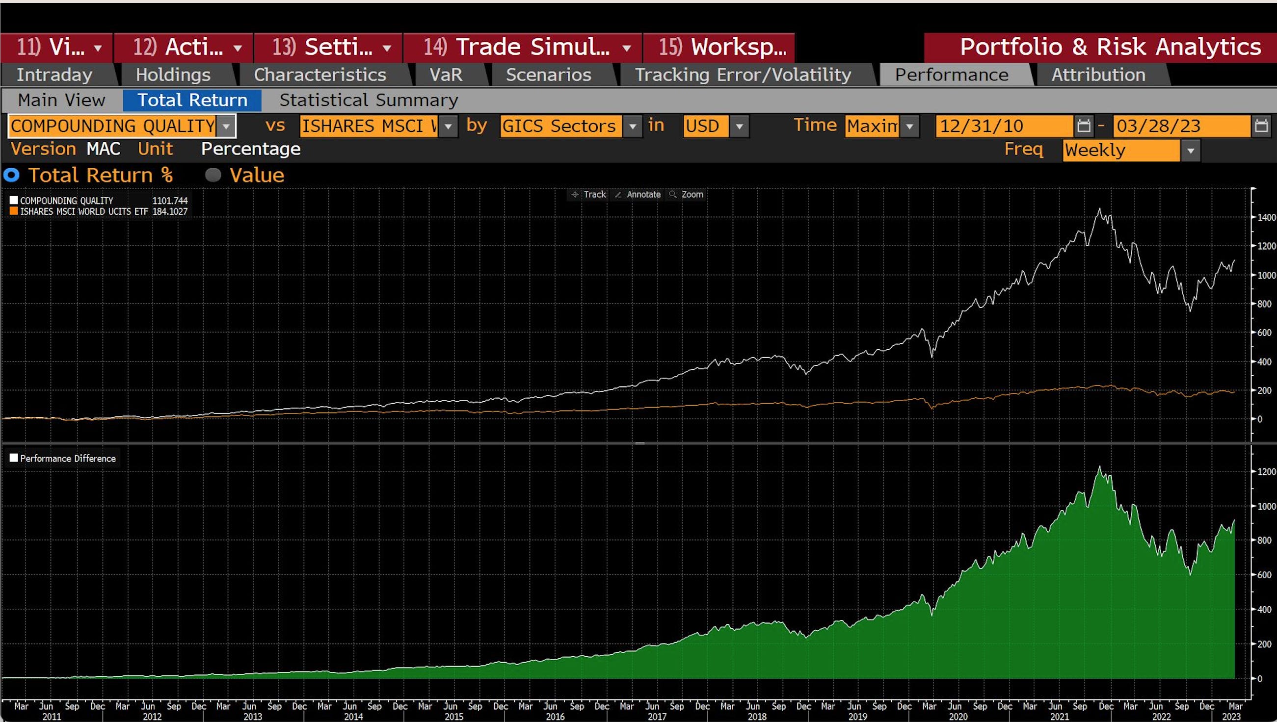 Since 2011, our investable universe (Compounding Quality) increased with 1100% (!) compared to 184% for the MSCI World.