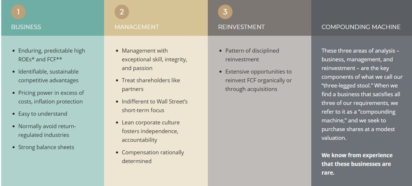 Via its 3-legged stool, Chuck Akre wants to invest in compounding machines.
