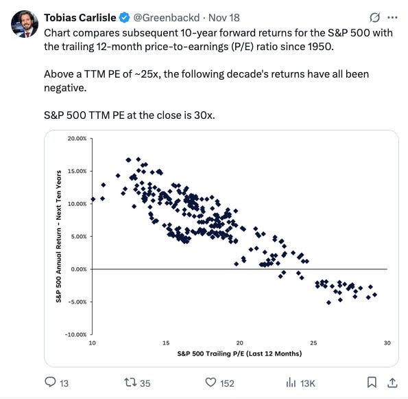 The S&P 500 is valued so rich that we should statistically expect negative returns for the index.