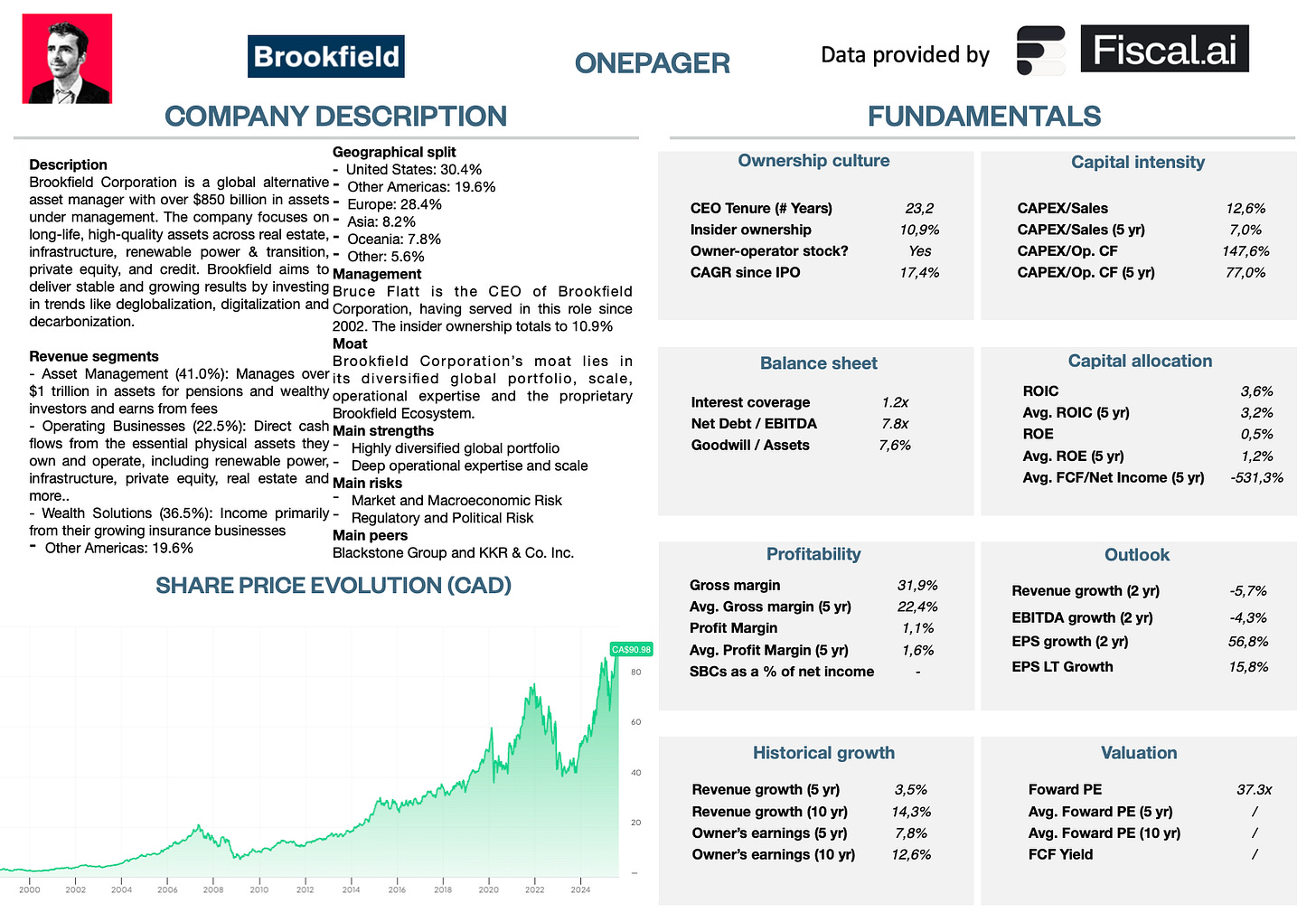 Brookfield Corporation is a giant holding company. They manage over $1 trillion and own real-world assets like power plants, toll roads, and more. They earn fees and profits from this empire, then reinvest the cash to grow even bigger.