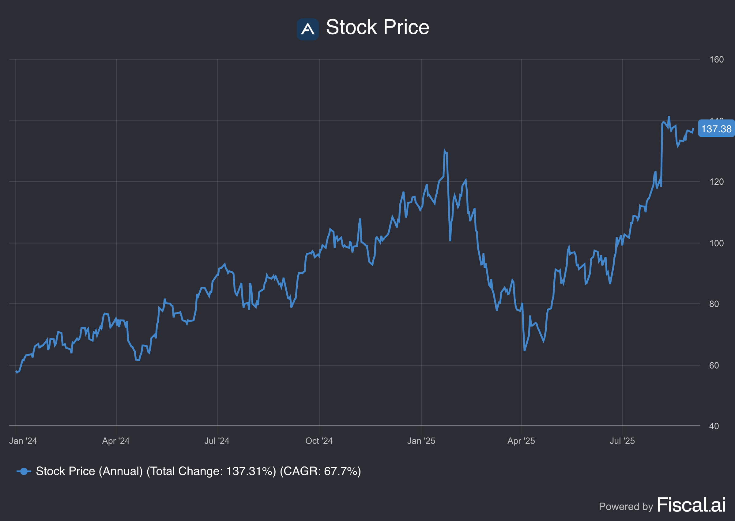 Arista Networks is back on the list. Since April, the stock has doubled.