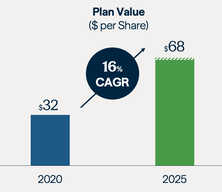 In the 2025 Investor Day presentation, management showed that its Plan Value per Share grew from $48 in 2020 to $102 in 2025.