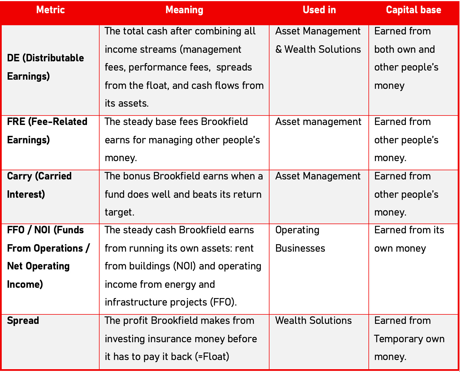 This is why Brookfield reports other measures like, Distributable Earnings (DE), Fee-Related Earnings (FRE), Carried Interest (Carry), Funds From Operations (FFO) and Spread.