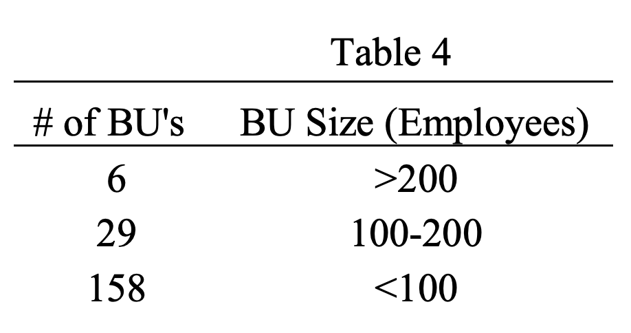 The typical acquisition size is in the $2-$5 million range. In other words, these are small companies with a small number of employees. As you can see below, most of CSIâs Business Units (BU) have fewer than 100 employees.