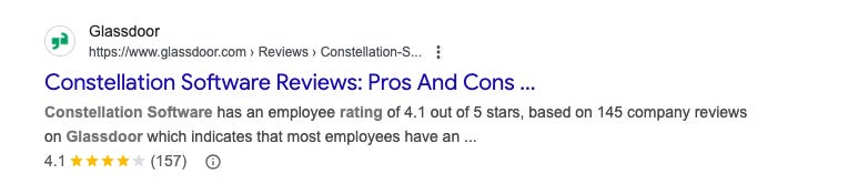 We can also look at Constellation Softwareâs Glassdoor rating. CSI gets a 4.1/5 on Glassdoor.