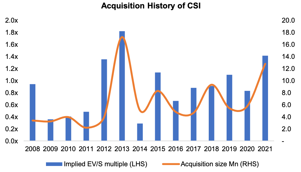 Serial acquirers typically rely on one or two brilliant capital allocators at the top. As the company grows, it cannot scale its human capital fast enough and keeps relying on a few bright minds. To maintain reinvestment rates, they shift toward larger acquisitions, which usually generate lower returns. CSI is the only acquirer that seems to avoid the laws of gravity.
