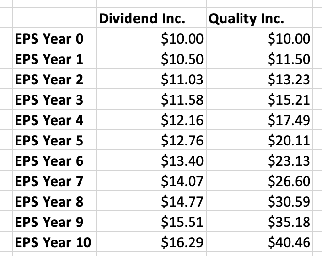 And this all happened while Quality Inc.’s P/E ratio declined from 30x to 20x while the valuation of Dividend Inc. remained constant.