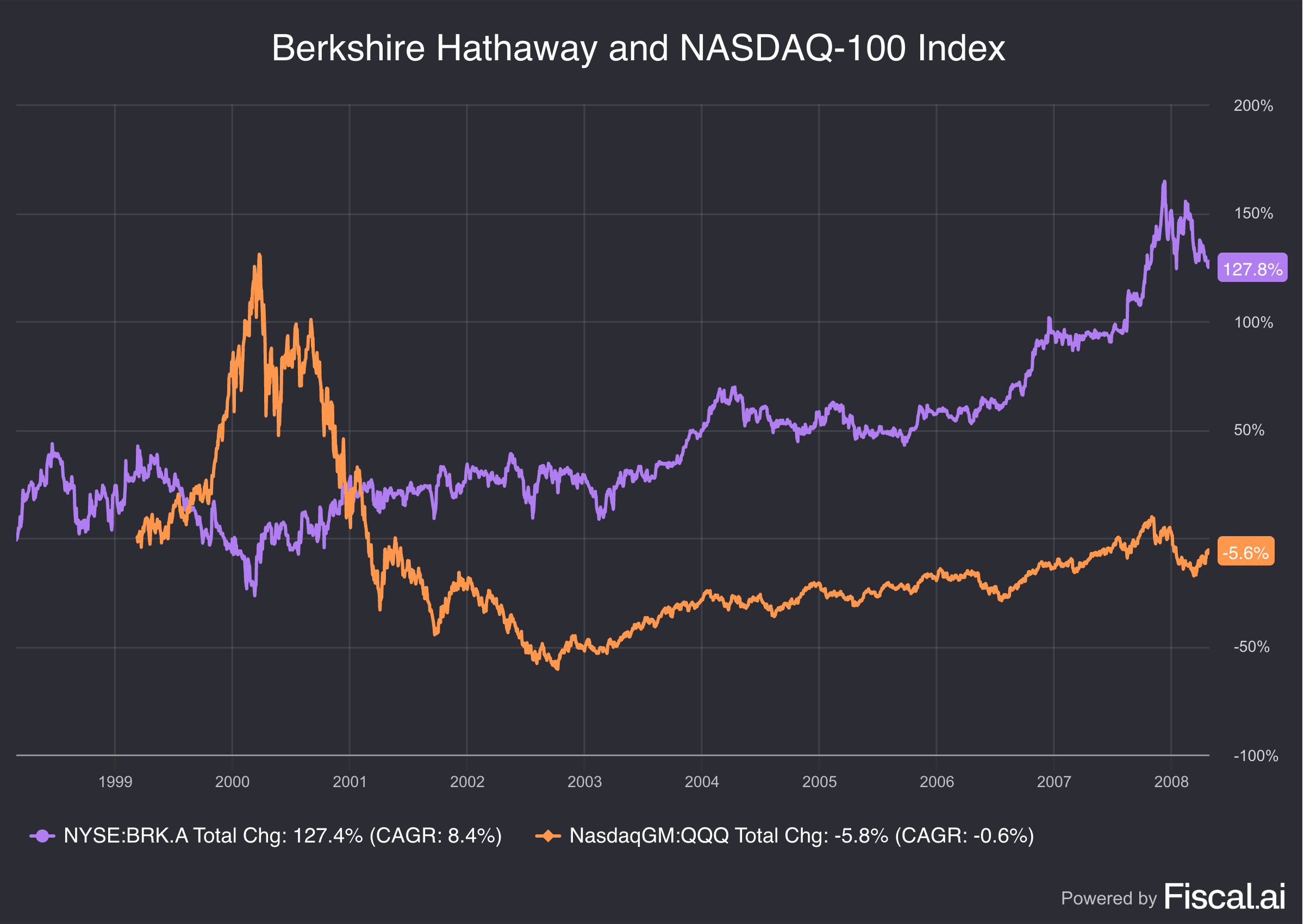 The dot-com bubble burst in 2000, and many of those high-flyers went to zero. Berkshire more than doubled in value.