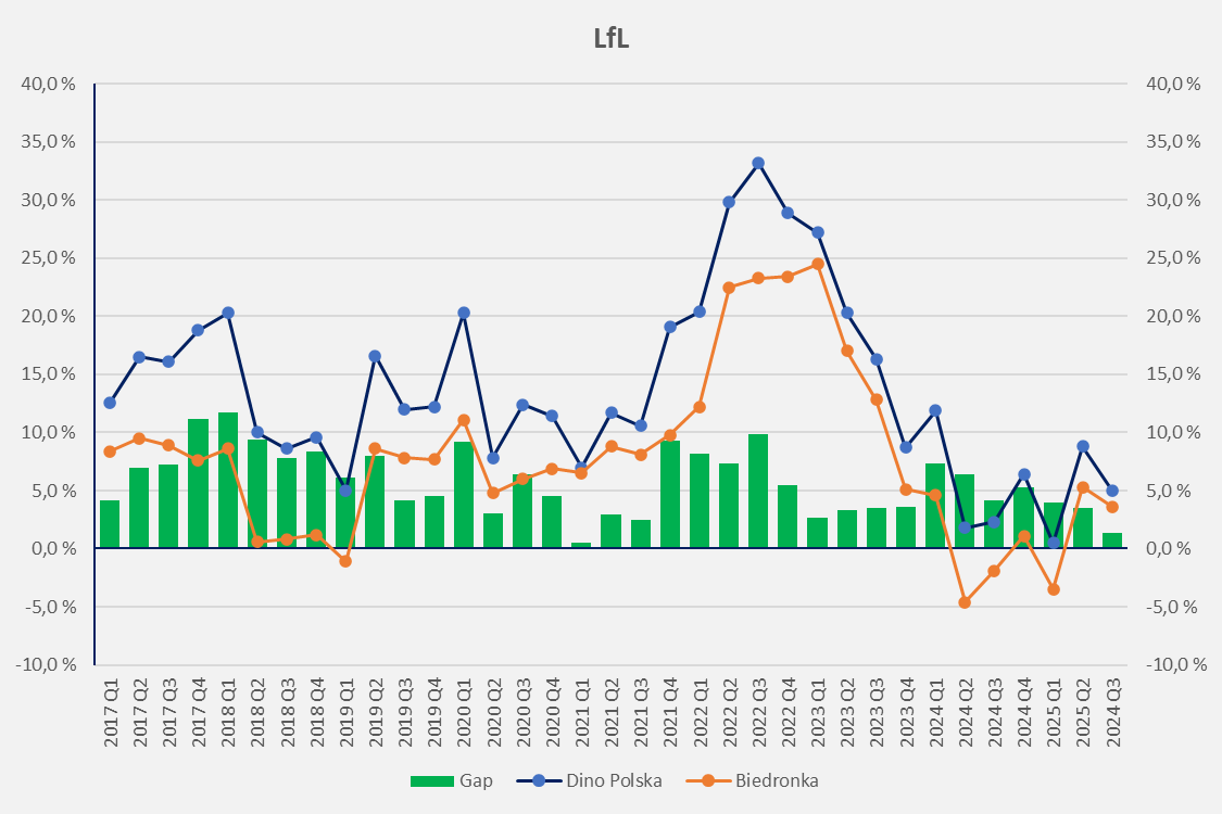 Like-for-like growth measures how sales change in existing stores, excluding new store openings. It shows whether a company is actually selling more to customers, and not just growing by expanding its store count.Here’s a graph that shows the declining like-for-like growth of Dino Polska (blue line) and its most important competitor Biedronka (orange line):