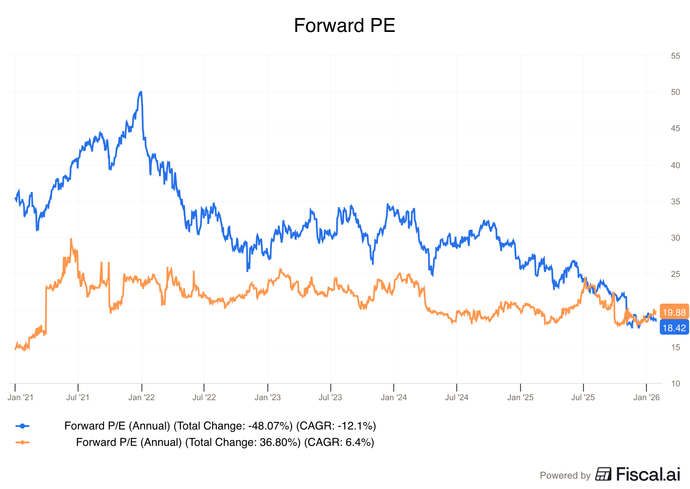 If we compare the evolution of the intrinsic value for both companies, we get the following: