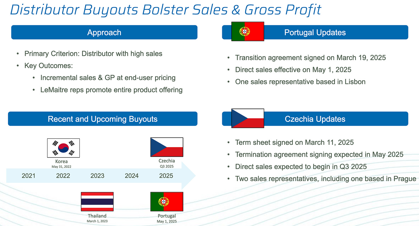 LeMaitre also maintains a lean structure: they often acquire entire companies outright and integrate operations quickly to achieve cost and revenue synergies.