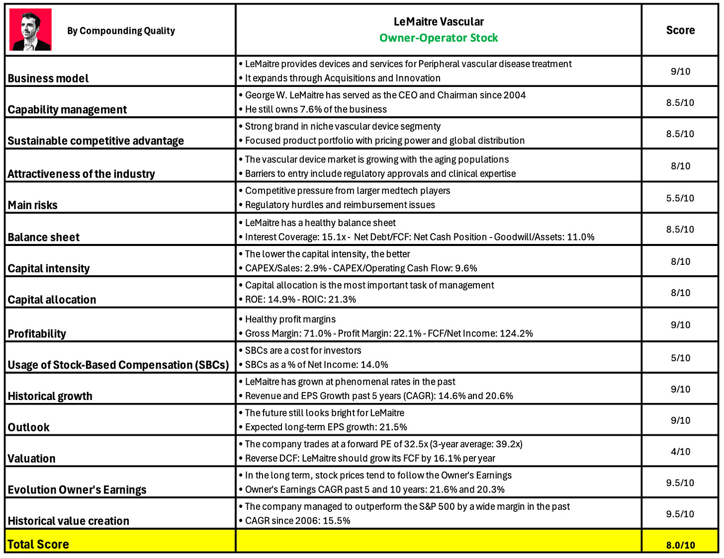 As you can see in the table below, LeMaitre Vascular gets a Total Quality Score of 8.0/10