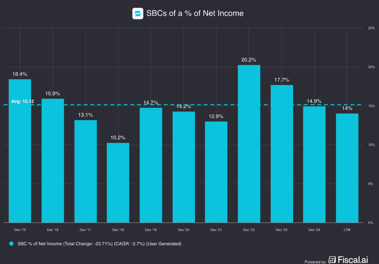Avg. SBC as a % of Net Income past 5 years: 15.6% (SBCs/Net income < 10%? ❌)