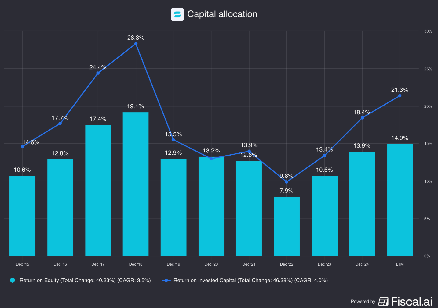 Return on Capital (ROIC): 21.3% (ROIC > 15%? ✅)