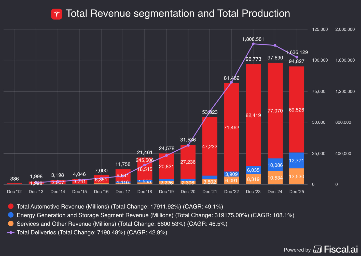 Energy Generation and Storage (13.5% of sales): Solar panels and batteries (Megapacks) sold to store power for cities and data centers
