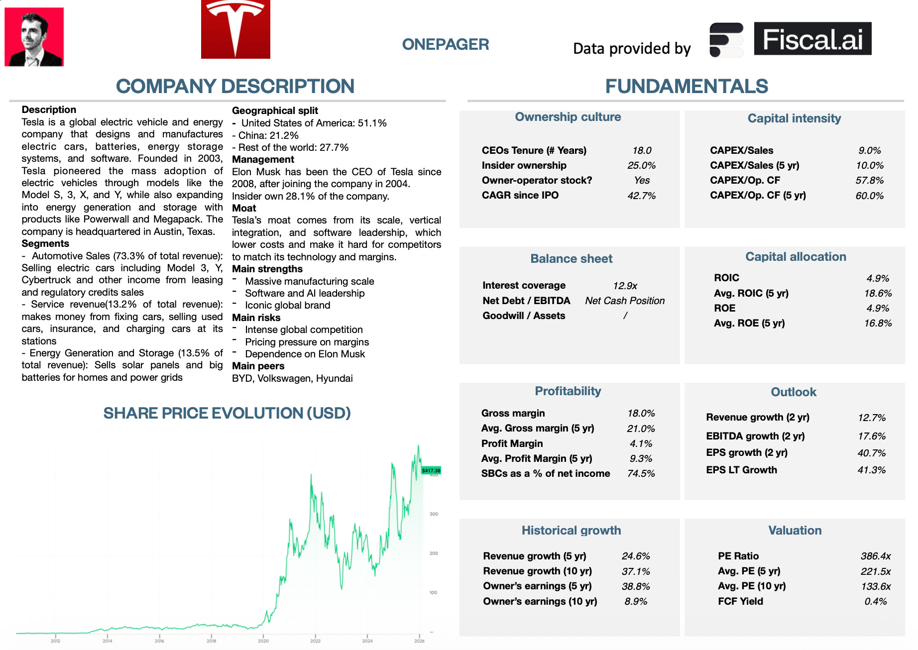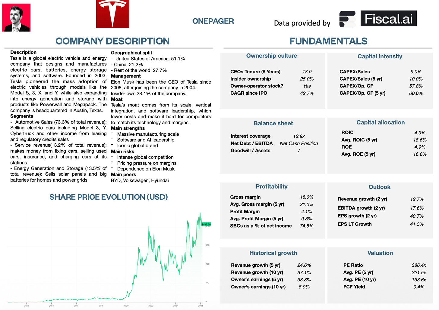 Elon Musk: He’s a genius and a wildcard. His tweets move the stock, his politics alienate buyers, and he runs 5 companies at once, bringing a lot of unpredictability