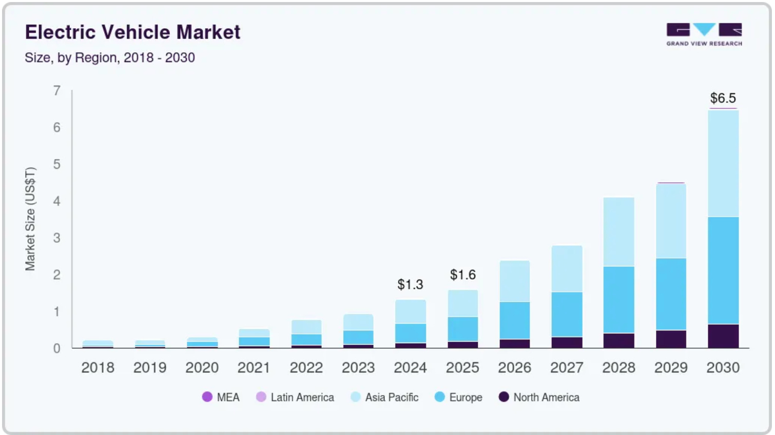 The global electric vehicle market is projected to reach over $6 trillion by 2030 growing at a 32% CAGR.