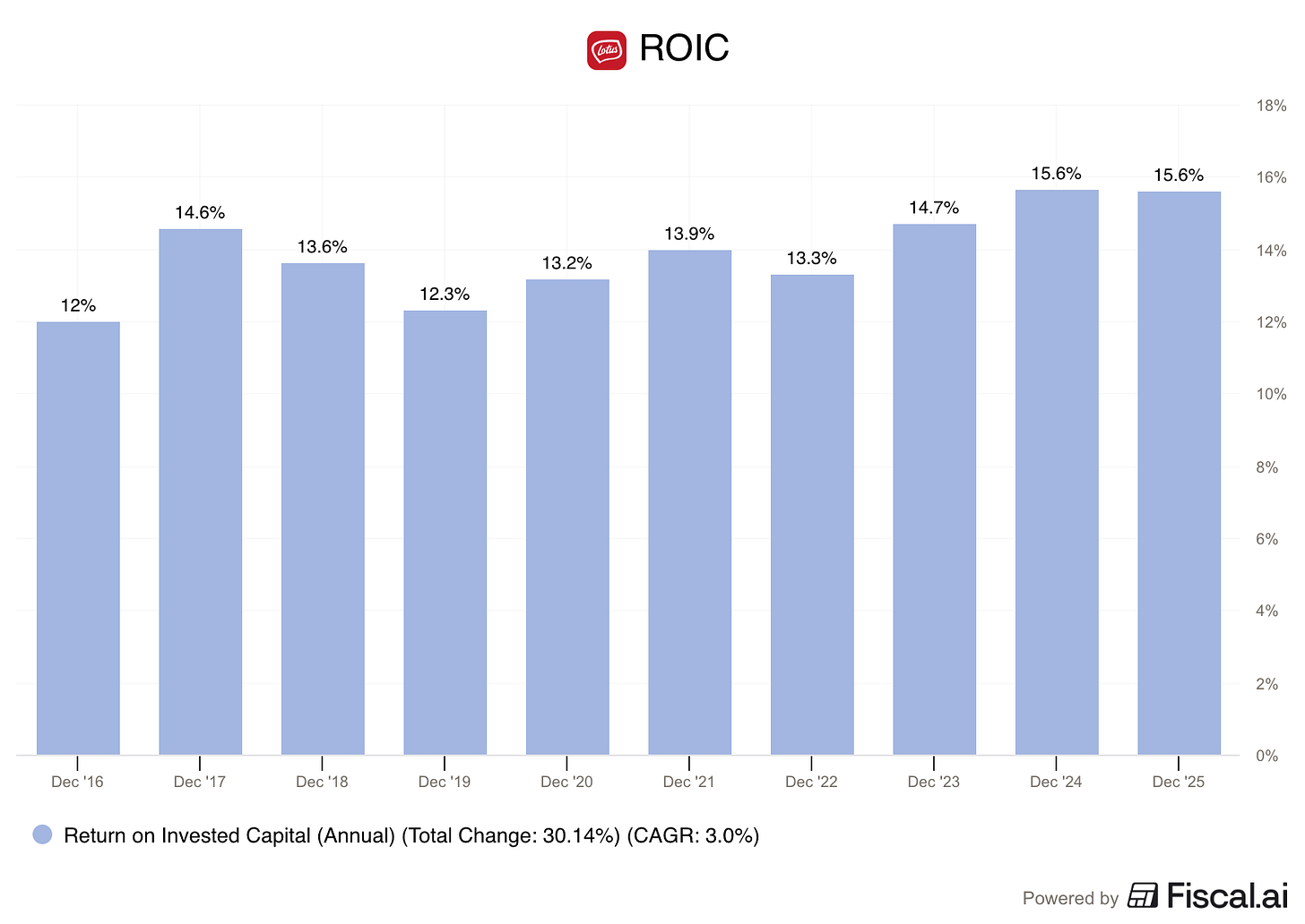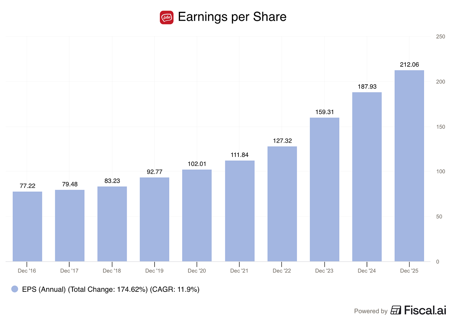 Lotus Bakeries has grown its EPS by almost 12% per year for the last decade.