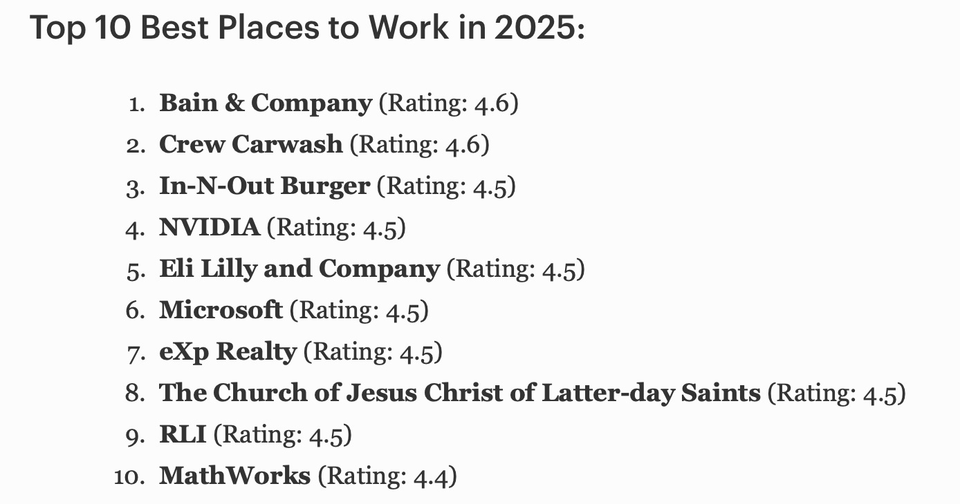 Here are 2025’s 10 Best Places to Work according to Glassdoor: