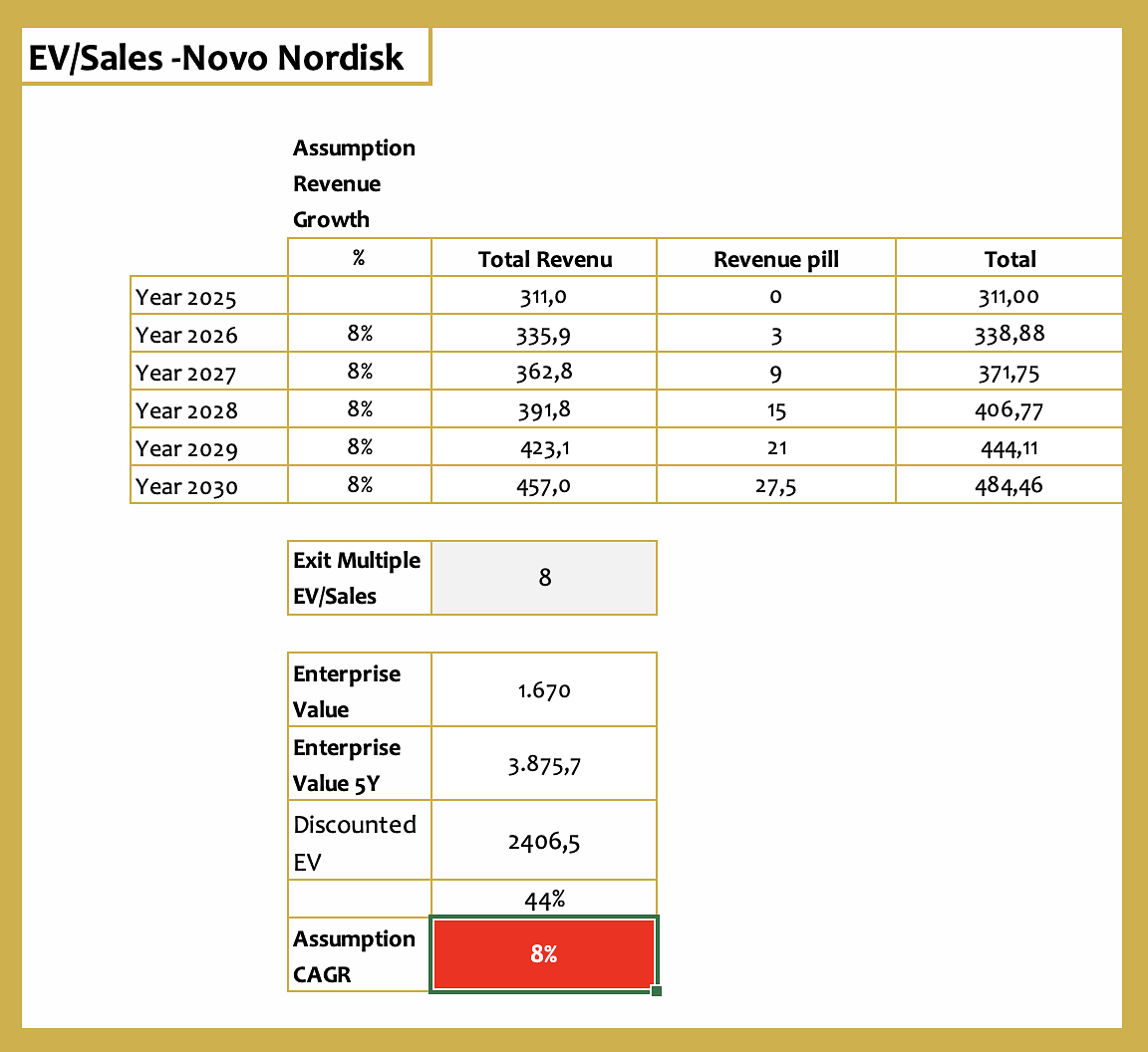 As an exit multiple, I used EV/Sales of 8. This is higher than today’s level, but I don’t believe Novo Nordisk will remain this cheap over the next five years. It is also still below the 10-year average of 9.2%. For comparison, Eli Lilly currently trades at an EV/Sales of 13, so 8 seems reasonably conservative in my view.