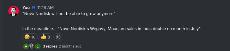 I want to share my personal experience with a GLP-1 drug, which has been truly life-changing after years of struggling with weight gain and worsening health markers despite disciplined exercise and a strict low-carb diet. In just three weeks of taking an oral GLP-1 treatment, my blood sugar has normalized, my inflammation has gone down, my blood pressure has improved, and I’m losing weight. Most importantly, I finally feel in control of my food cravings. These drugs feel more like hormone correction than simple weight-loss tools, giving me transformative health benefits that diet and exercise alone couldn’t provide. Affordable, effective, and accessible GLP-1s have the potential to reshape medicine—and I believe this will also create major opportunities for companies like Novo and Lilly.