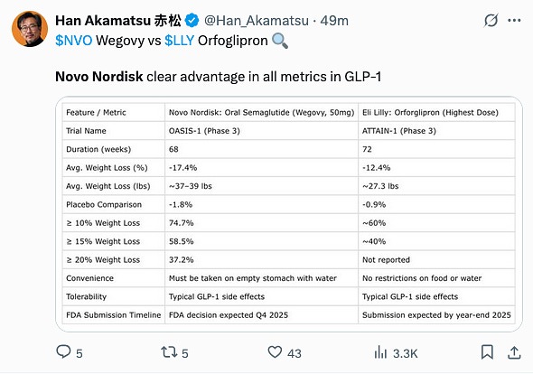 And guess what? It’s not the case that Eli Lilly is outperforming Novo Nordisk on all metrics. Just look at this tweet from Han Akamatsu: