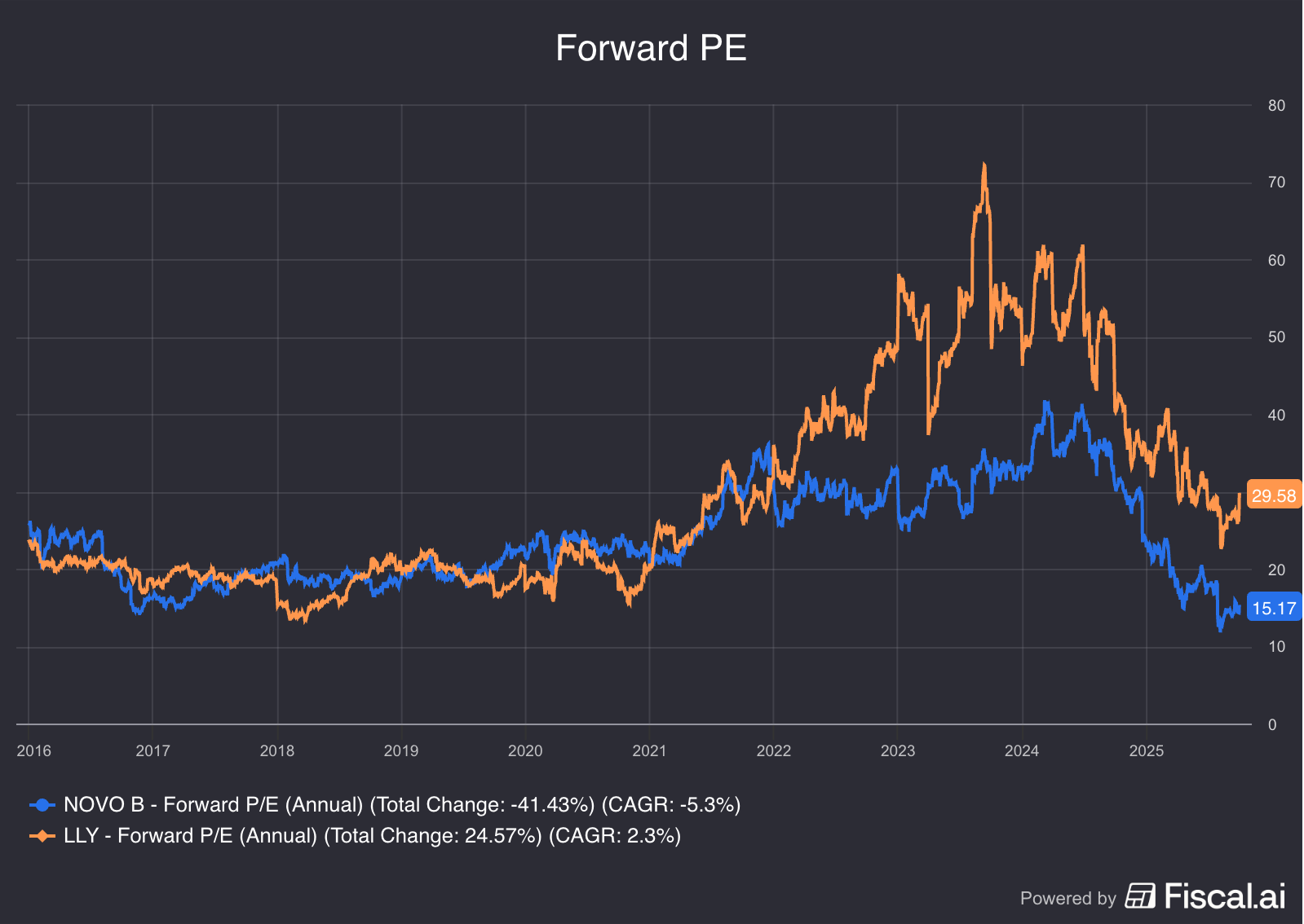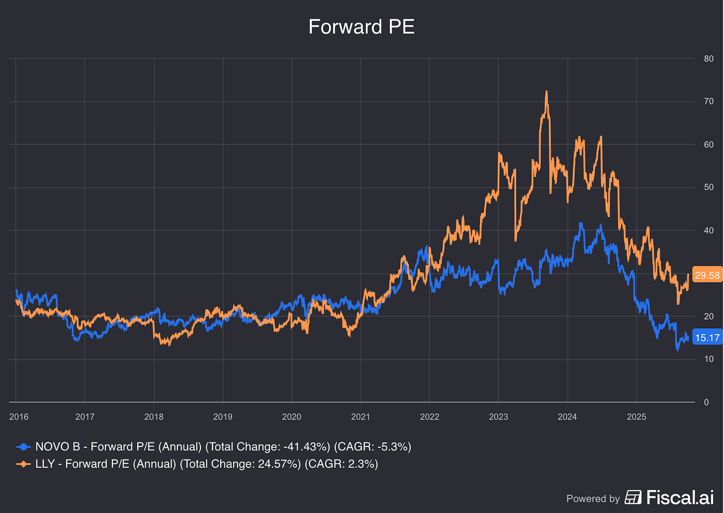 Today, Novo Nordisk is twice (!) as cheap as Eli Lilly.