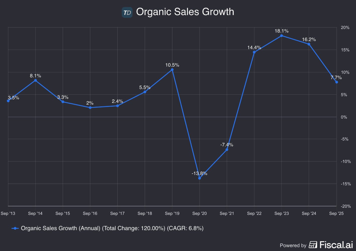 In the most recent quarterly numbers, sales were up 13.9% (of which 7.4% organic) once again.