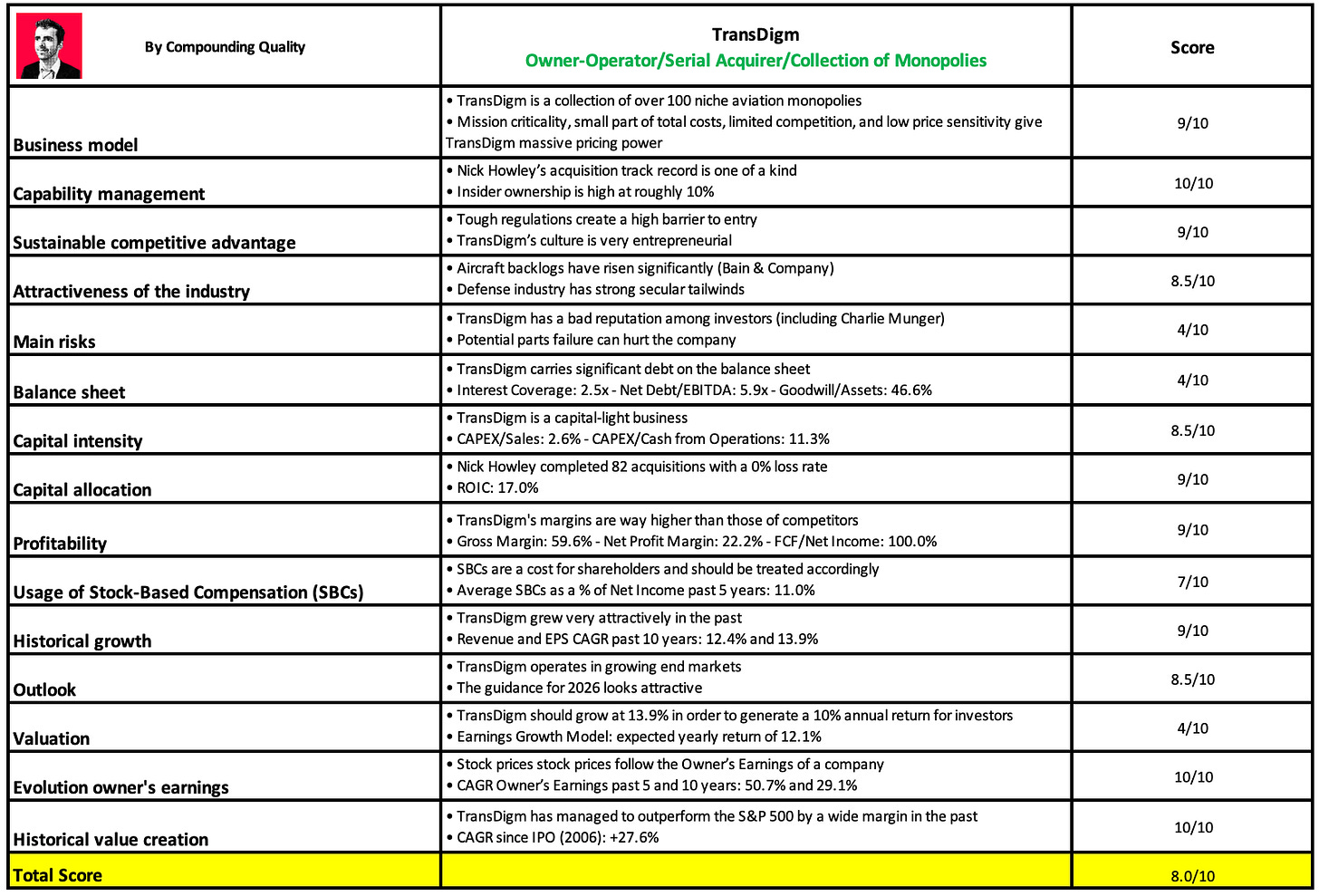 Finally, let’s bring everything together and give TransDigm a Total Quality Score.