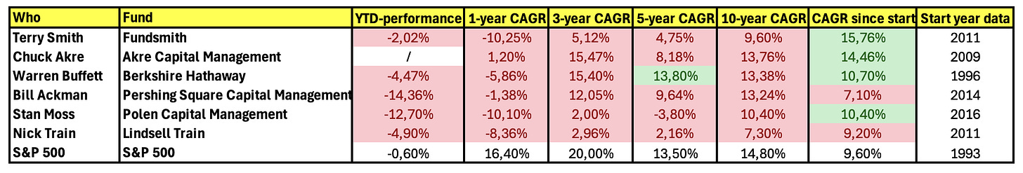 Top investors like Terry Smith, Chuck Akre, Warren Buffett, and Bill Ackman have all fallen short of the index over the past three years.