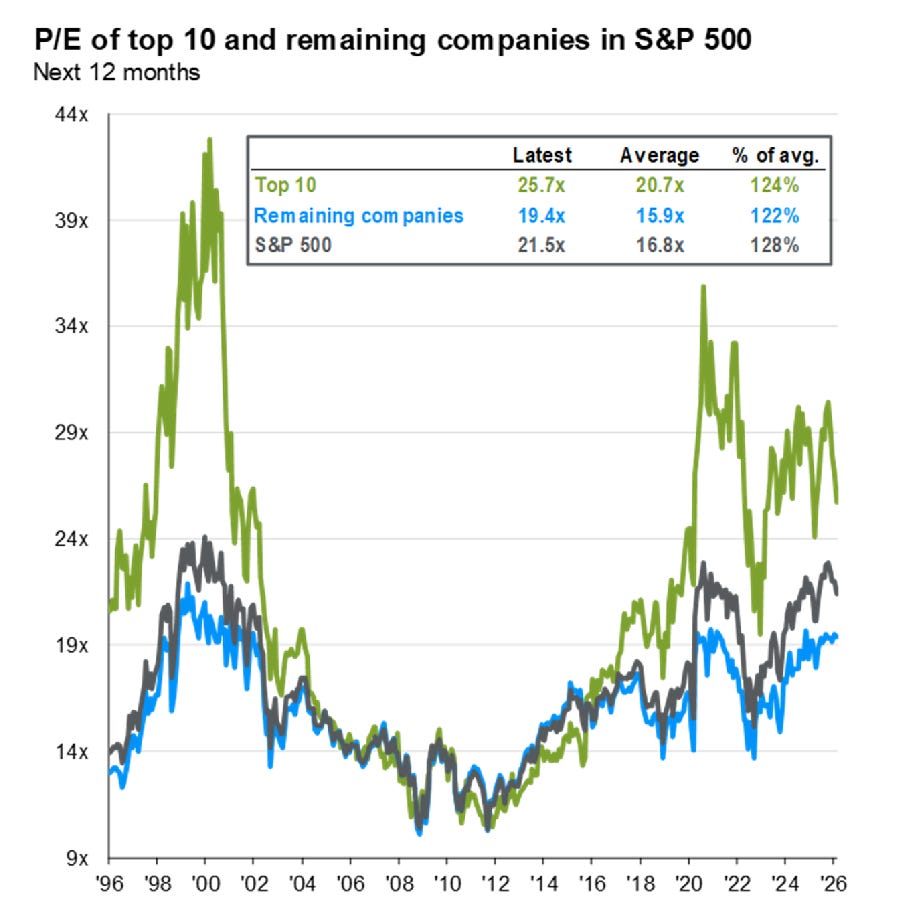 Once the largest companies are removed, the broader market appears far more reasonably valued.