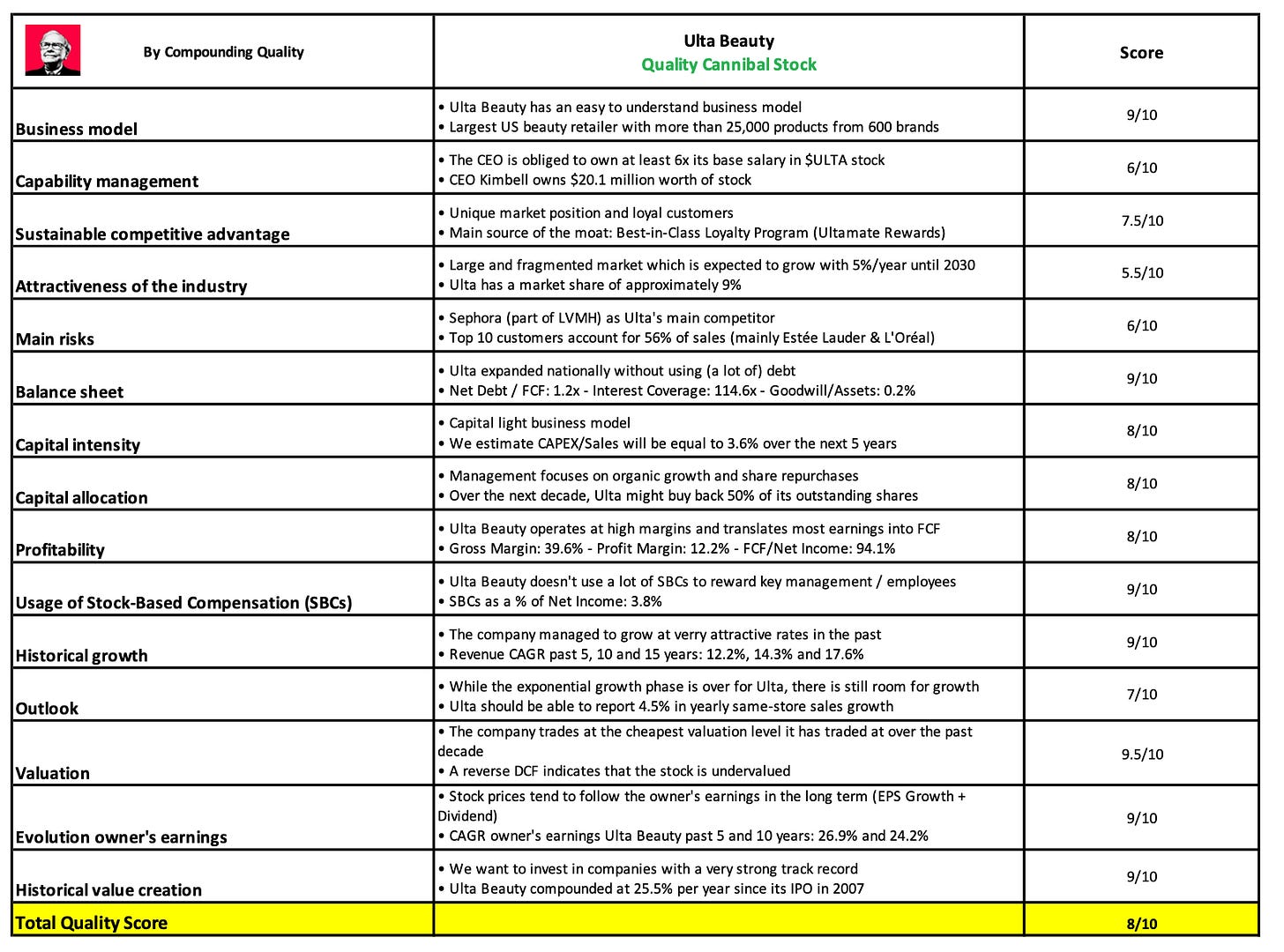 As you can see in the table below, Ulta Beauty gets a Total Quality Score of 8/10.